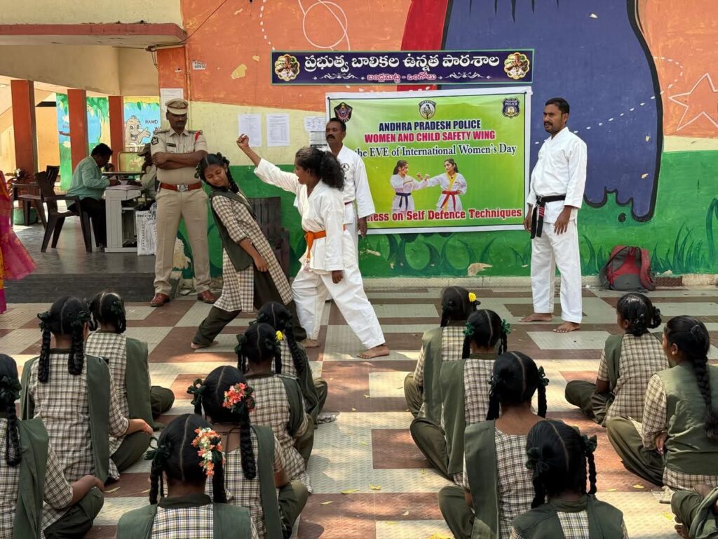 అంతర్జాతీయ మహిళా దినోత్సవ వారోత్సవాల్లో భాగంగా ఆత్మ రక్షణపై ప్రతి ఒక్క విద్యార్థినికి అవగాహన కల్పించాలని ఉద్దేశంతో ప్రకాశం జిల్లా ఎస్పీ శ్రీ వి హర్షవర్ధన్ రాజు,ఐపీఎస్., ఆదేశాల మేరకు ఆయా పోలీస్ స్టేషన్ పరిధిలోని పోలీస్ అధికారులు పాఠశాలలు/కళాశాలలు విద్యార్థినిలకు ఆత్మరక్షణ గురించి నిపుణులైన శిక్షకులతో అవగాహన కార్యక్రమం నిర్వహించడం జరిగింది. ఆత్మ రక్షణలో భాగంగా శత్రువుల నుండి తమను తాము ఎలా రక్షించు కోవాలో సెల్ఫ్ డిఫెన్స్ టెక్నిక్స్ నేర్పించారు. ఈ సందర్బంగా పోలీస్ అధికారులు మాట్లాడుతూ నేటి సమాజంలో మహిళలు అనేక సవాళ్లను ఎదుర్కొంటున్నారని, మహిళలపై దాడి జరిగే సమయంలో తమను తాము రక్షించుకోవడం చాలా అవసరమన్నారు. సెల్ఫ్ డిఫెన్స్ అంటే కేవలం శారీరక శక్తి మాత్రమే కాదు, అనుకూల, ప్రతికూల సమయాల్లో ఎవరైనా దాడికి పాల్పడితే ప్రతిస్పందించే సామర్థ్యాన్ని పెంచుకోవడమన్నారు. సెల్ఫ్ డిఫెన్స్ మహిళలకు ఆత్మవిశ్వాసాన్ని పెంచుతుందని , మహిళలను శారీరకంగా, మానసికంగా బలంగా చేస్తుందన్నారు. మహిళలకు తమను తాము రక్షించుకోవడానికి అవసరమైన నైపుణ్యాలను అందిస్తుందన్నారు. ఈ సెల్ఫ్ డిఫెన్స్ ప్రతి మహిళలకు ఎంతగానో ఉపయోగపడుతుందని తెలియజేశారు.మహిళా చట్టాలు, ఫోక్సో ఆక్ట్, ర్యాగింగ్, ఈవ్ టీజింగ్, గుడ్ టచ్ బాడ్ టచ్, సామాజిక మాధ్యమాలు మరియు సైబర్ క్రైమ్స్ పై తీసుకోవలసిన జాగ్రత్తలు తెలుసుకొని ఉండాలని, బాలికలు తప్పనిసరిగా స్వీయ రక్షణ కలిగి ఉండాలని, ఎదుటివారి నుండి తమను తాము రక్షించుకోవడం నేర్చుకోవాలని తెలిపారు.మహిళలు/చిన్నారులకు అత్యవసర సమయంలో సహాయం కొరకు హెల్ప్లైన్ నెంబర్లకు కాల్ చేసి పోలీసుల సహాయం పొందాలన్నారు. చైల్డ్ హెల్ప్ లైన్:1098, ఉమెన్ హెల్ప్ లైన్:181, పోలీస్ హెల్ప్ లైన్:100 / 112, సైబర్ క్రైమ్ హెల్ప్ లైన్:1930, పోలీస్ కంట్రోల్ రూమ్: 9121102266 అని తెలియజేశారు.