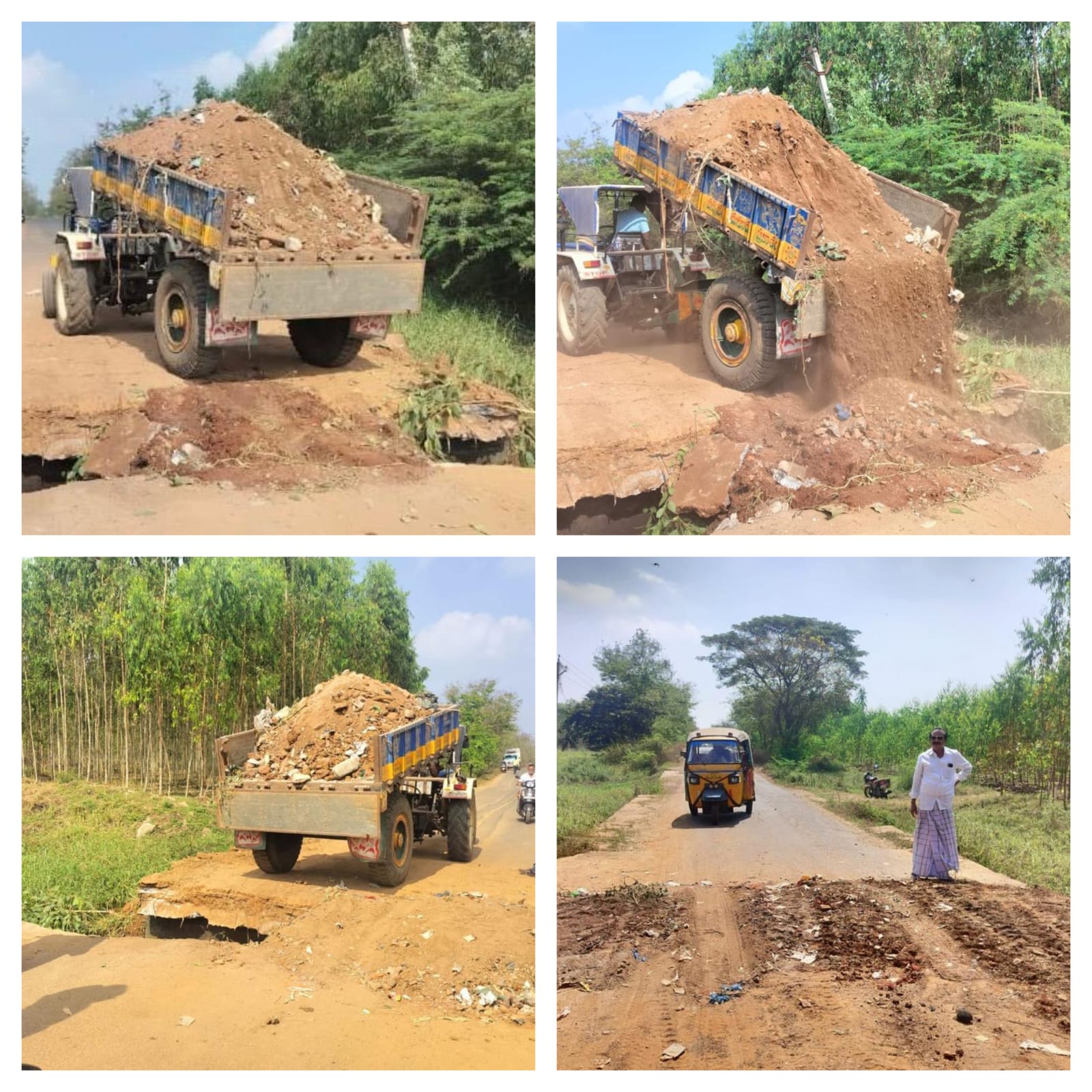 కందుకూరు నుంచి చుట్టుగుంట వెళ్లే రోడ్డులో పల్లెవాగుపై పురాతన కల్వర్టు సోమవారం రాత్రి కుంగిపోయింది. 35 సంవత్సరాల క్రితం నిర్మించిన కల్వర్టు పైపులు పగిలిపోయి గుంత ఏర్పడింది. దీంతో కందుకూరు నుంచి చుట్టుగుంట మీదుగా ఉలవపాడుకు రాకపోకలు నిలిచిపోయాయి. దీనిపై వెంటనే స్పందించిన ఎమ్మెల్యే ఇంటూరి నాగేశ్వరరావు … రాకపోకలు కొనసాగే విధంగా, కల్వర్టుకు ఏర్పడ్డ గుంత పూడ్చాలని మున్సిపల్ కమిషనర్ అనూష ను ఆదేశించారు. దీంతో అధికారులు మట్టితో తాత్కాలికంగా మరమ్మత్తులు చేశారు. కల్వర్తును పూర్తిగా మట్టితో పూడ్చడంతో రాకపోకలు మళ్లీ మొదలయ్యాయి. ఎమ్మెల్యే స్పందించిన తీరు పట్ల చుట్టుపక్కల గ్రామాల ప్రజలు, ప్రయాణికులు హర్షం వ్యక్తంచేశారు.