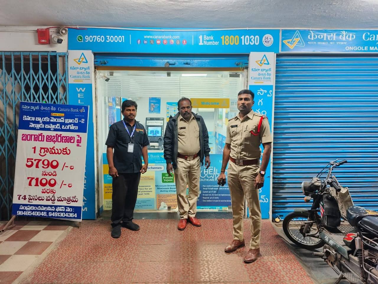 ప్రకాశం జిల్లా ఎస్పీ ఆదేశాల మేరకు, ఒంగోలు పట్టణంలో ఉన్న వివిధ ఏటీఎం కేంద్రాల్లో ప్రకాశం జిల్లా పోలీసులు భద్రతా తనిఖీలు నిర్వహించారు. ఈ తనిఖీలను పీసీఆర్ ఎస్ఐ పి. రాజేష్ ఆధ్వర్యంలో నిర్వహించారు.తనిఖీల సందర్భంగా ఏటీఎం కేంద్రాల్లో సీసీ కెమెరాల పనితీరు, లైటింగ్ వ్యవస్థ, భద్రతా ఏర్పాట్లు మరియు పరిసరాల పర్యవేక్షణను పోలీసులు పరిశీలించారు.ఏటీఎం కేంద్రాల వద్ద అనుమానాస్పద వ్యక్తులు లేదా కార్యకలాపాలు కనిపిస్తే వెంటనే పోలీసులకు సమాచారం అందించాలని బ్యాంకు సిబ్బంది మరియు భద్రతా సిబ్బందికి సూచనలు చేశారు.ప్రజల భద్రత, ఆర్థిక లావాదేవీల రక్షణే లక్ష్యంగా ఇటువంటి తనిఖీలు నిరంతరం కొనసాగిస్తామని ప్రకాశం జిల్లా పోలీసులు తెలిపారు.