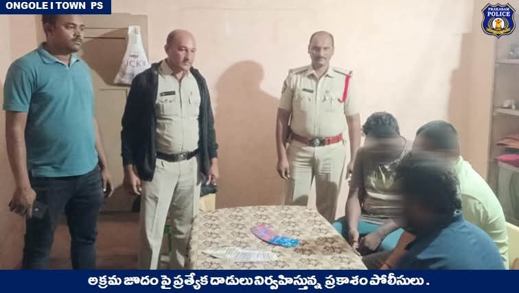 అక్రమ కార్యకలాపాల నిర్మూలనలో భాగంగా, ప్రకాశం జిల్లా ఎస్పీ ఆదేశాల మేరకు, జిల్లా పోలీసులు నిరంతర ప్రత్యేక దాడులు నిర్వహిస్తున్నారు. ఆ దర్యాప్తు చర్యల్లో భాగంగా, ఒంగోలు వన్ టౌన్ సీఐ నాగరాజు పర్యవేక్షణలో, పోలీసులు సీతారాంపురం ప్రాంతంలో అక్రమంగా జరుగుతున్న జూదంపై ఆకస్మిక దాడులు చేశారు.దాడి సమయంలో అక్రమ గ్యాంబ్లింగ్లో నిమగ్నమైన 3 మందిని పట్టుకుని, వారి వద్ద నుండి ₹4,880 నగదు మరియు జూదానికి ఉపయోగించిన వస్తువులను స్వాధీనం చేసుకున్నారు. నిందితులపై కేసులు నమోదు చేసి, తదుపరి విచారణ చేపట్టారు.