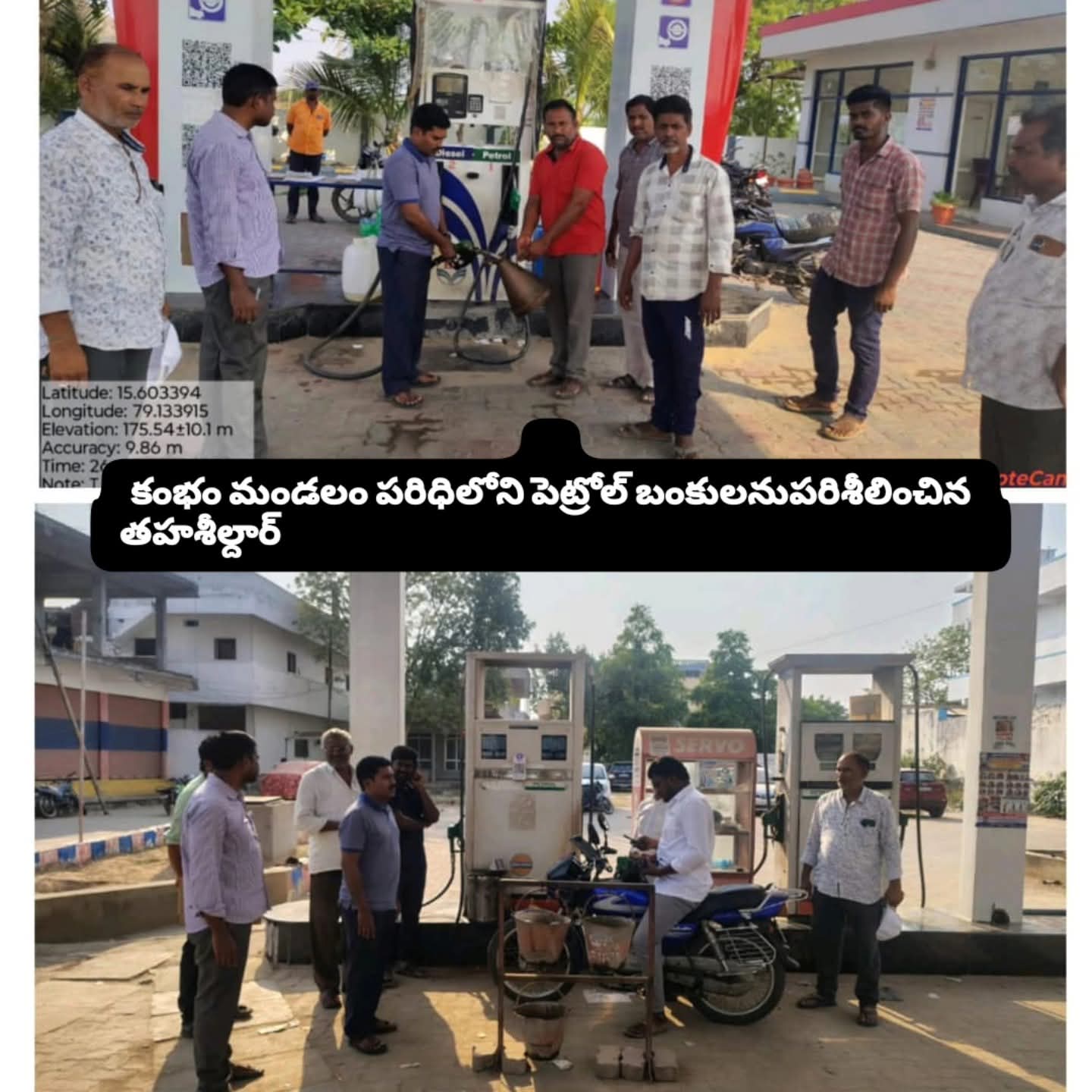 మార్కాపురం జిల్లా కంభం మండలంలోని పలు పెట్రోల్ మరియు డీజిల్ కొరత వున్నదని వస్తున్నటువంటి అపోహాల పైన ఈరోజు ఆదివారం నాడు కంభం మండలం తహశీల్దార్ వి. కిరణ్, ఆర్.ఐ టి. ఆంజనేయులు మరియు వీఆర్వోలు మండల పరిధిలోని బంకులను పరిశీలించి ప్రజలకు పెట్రోల్ మరియు డీజిల్ అందరికి అందుబాటులో వున్నదని ఎవ్వరు కూడా పెట్రోల్ మరియు డిజిల్ లేదు అనే అపోహాలను నమ్మవద్దు అని ఏఏ బంకు నందు ఎంత పెట్రోల్ మరియు డీజిల్ ఉన్నదో వాటి వివరాలను తెలిపారు. కందులాపురం తర్లుపాడు రోడ్డులో బంకు నందు డీజిల్ 1000 లీటర్లు, పెట్రోల్ 2100 లీటర్లు,కాగితాల గూడెం బేస్తవారిపేట రోడ్డు బంకు నందు డిజిల్ 400 ల లీటర్లు, పెట్రోల్ 200 ల లీటర్లు, స్టేట్ బ్యాంకు బంకు నందు డీజిల్ 200 ల లీటర్లు, పెట్రోల్ 3000 ల లీటర్లు, తురిమెళ్ళ గ్రామం నందు బంకులో డిజిల్ 10854 లీటర్లు,పెట్రోల్ 7500 ల లీటర్లు స్టాక్ ఉన్నదని కావున కంభం మండలలోని ప్రజలు పెట్రోల్ మరియు డీజిల్ నకు ఎటువంటి కొరత లేదని ఆందోళన పడవలసిన అవసరం లేదని తహశీల్దార్ వి.కిరణ్ తెలియజేశారు.ఈ కార్యక్రమంలో రెవెన్యూ అధికారులు, సిబ్బంది పాల్గొన్నారు.