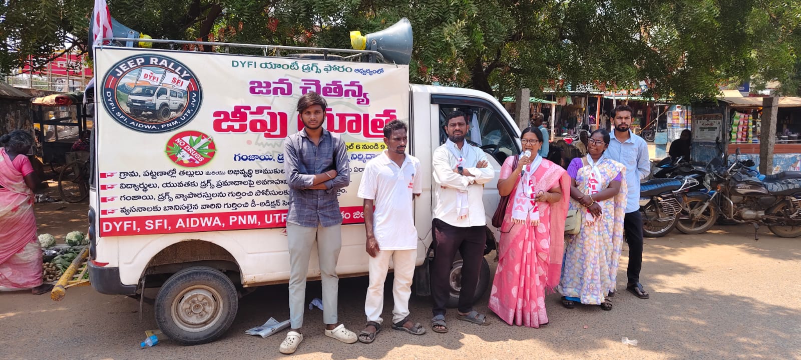 సమాజాన్ని గంజాయి డ్రగ్స్ రహిత సమాజ నిర్మాణం లో ప్రతి ఒక్కరూ భాగస్వాములై కాపాడుకోవాలని ఐద్వా జిల్లా కార్యదర్శి కె.రమాదేవి పిలుపు ఇచ్చారు.డి వై ఎస్ ఎఫ్ ఆధ్వర్యంలో చేపట్టిన డ్రగ్స్ వ్యతిరేక ఫోరం చేపట్టిన జన చైతన్య యాత్ర లో ఆమె సింగరాయకొండ బొమ్మల కూడలి కందుకూరు రోడ్డు వద్ద ప్రజలకు అవగాహన కల్పించే కార్యక్రమం లో పాల్గొన్నారు. ఈ సందర్భంగా రమాదేవి అవగాహన కల్పిస్తూ విద్యార్థులు యువకులు డ్రగ్స్ మహమ్మారి ఊబిలో పడి జీవితాలని నాశనం చేసుకోవద్దని హితవు చెప్పారు. మత్తు పదార్థాల కి వ్యతిరేకంగా ఉద్యమించాలి డివైఎఫ్ఐ యాంటీ డ్రగ్స్ జన చైతన్య జీపు యాత్ర విద్యార్థులు యువకులు మత్తు పదార్థాలకు చెడు వ్యసనాలకి దూరంగా ఉండాలని విద్యార్థులు యువకులు మీ జీవితలని నాశనం చేసుకోవద్దు అని కోరారు. గంజాయి రహిత సమాజాన్ని నిర్మించడం లో ప్రతి ఒక్కరు పాటుపడాలని ఐద్వా జిల్లా కార్యదర్శి కె రమాదేవి అన్నారు. ప్రస్తుతం మన సమాజాన్ని వేధిస్తున్న అత్యంత ప్రమాదకర సమస్యల్లో గంజాయి మరియు మాదక ద్రవ్యాల వ్యసనం ప్రధానంగా మారిందన్నారు. ముఖ్యంగా విద్యార్థులు యువకులును లక్ష్యంగా చేసుకొని డ్రగ్స్ మాఫియా తమ వల విస్తరిస్తుందని మహిళలలు కూడా తమ పరిసర ప్రాంతాల్లో గంజాయి డ్రగ్స్ మత్తు పదార్థాలు వాడే వారి పట్ల జాగ్రత్తగా ఉండాలని వాటిని అరికట్టేందుకు కలిసి రావాలని తమ పిల్లల్ని కూడా జాగ్రత్తగా చూసుకోవాలని వారు అన్నారు.నేటి సమాజంలో డ్రగ్స్ గంజాయిని నిర్మాలించాల్సిన ప్రజాప్రతినిధులే డ్రగ్స్ ని వాడుతు పోలీసులకి దొరుకుతున్నారని.ఏడు సంవత్సరాల బాలికలపై అత్యాచార జరుగుతున్నాయని. రాష్ట్రంలో గంజాయిని పట్టుకుంటున్నారని దీన్ని పూర్తిగా నిర్మూలించాలని వారు అన్నారు. అనంతరం మత్తు పదార్థాలు వాడకూడదని ప్రతిజ్ఞ చేయించారు.ఈ కార్యక్రమంలో డివై ఎఫ్ ఐ జిల్లా అధ్యక్షులు కె వి పిచ్చయ్య.యాంటీ డ్రగ్స్ ఫోరం బాలల సంఘం నాయకులు సిహెచ్ వినోద్.ఎస్ఎఫ్ఐ జిల్లా కార్యదర్శి వీరస్వామి.నాయకులు ఆకాష్. ప్రశాంత్. విజయ్. పిఎన్ఎమ్ జిల్లా నాయకురాలు సుజాత. డివైఎఫ్ఐ నాయకులు నవీన్. తదితరులు పాల్గొన్నారు