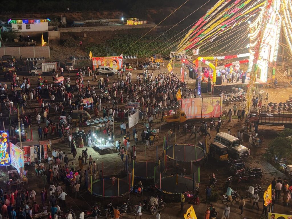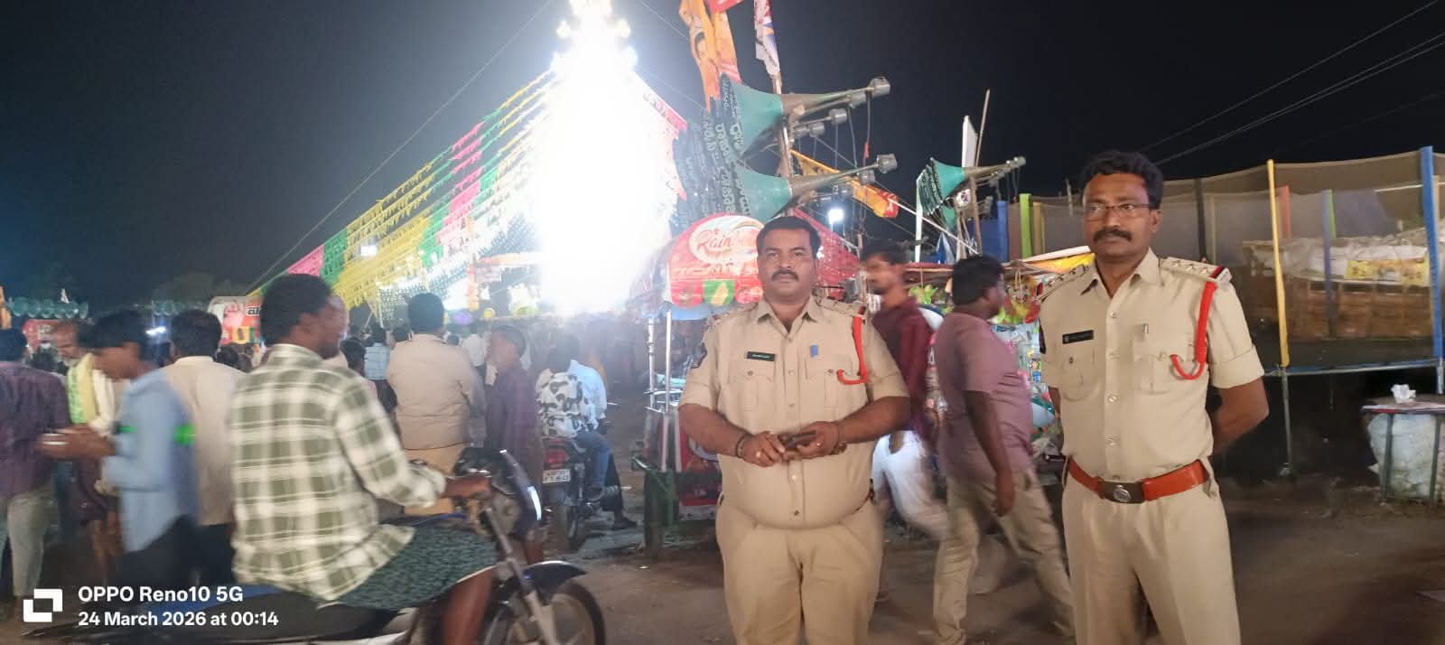 ప్రకాశం జిల్లా పోలీసుల ఆధ్వర్యంలో దర్శి పోలీస్ స్టేషన్ పరిధిలోని చందలూరు గ్రామంలో జరుగుతున్న పోలేరమ్మ తిరునాళ్ల సందర్భంగా కట్టుదిట్టమైన భద్రతా ఏర్పాట్లు చేపట్టారు. భారీగా భక్తులు తరలివచ్చే నేపథ్యంలో శాంతి భద్రతలను పటిష్టం చేయడానికి ఆధునిక సాంకేతికతను వినియోగిస్తున్నారు.“స్కై ఐ ప్రకాశం” ప్రాజెక్ట్లో భాగంగా డ్రోన్ సర్వైలెన్స్ను వినియోగిస్తూ తిరునాళ్ల ప్రాంగణం మరియు పరిసర ప్రాంతాలపై నిరంతర నిఘా ఏర్పాటు చేశారు. ఎలాంటి అవాంఛనీయ ఘటనలు తలెత్తకుండా ముందస్తు చర్యలు తీసుకుంటూ పోలీసులు ప్రత్యేక పర్యవేక్షణ కొనసాగిస్తున్నారు.భక్తుల రద్దీని దృష్టిలో ఉంచుకుని ట్రాఫిక్ నియంత్రణకు ప్రత్యేక చర్యలు చేపట్టడంతో పాటు, గుమికూడే ప్రదేశాల్లో పోలీసులు పటిష్ట బందోబస్తు ఏర్పాటు చేశారు. ప్రజలు ఎలాంటి ఇబ్బందులు లేకుండా పండుగను శాంతియుతంగా జరుపుకునేలా అన్ని విధాలుగా ఏర్పాట్లు చేశారు.ప్రకాశం జిల్లా పోలీసులు ప్రజల భద్రతను ప్రధాన లక్ష్యంగా తీసుకుని, పండుగలు సురక్షిత వాతావరణంలో జరగేలా కట్టుబడి పనిచేస్తున్నట్లు తెలిపారు.