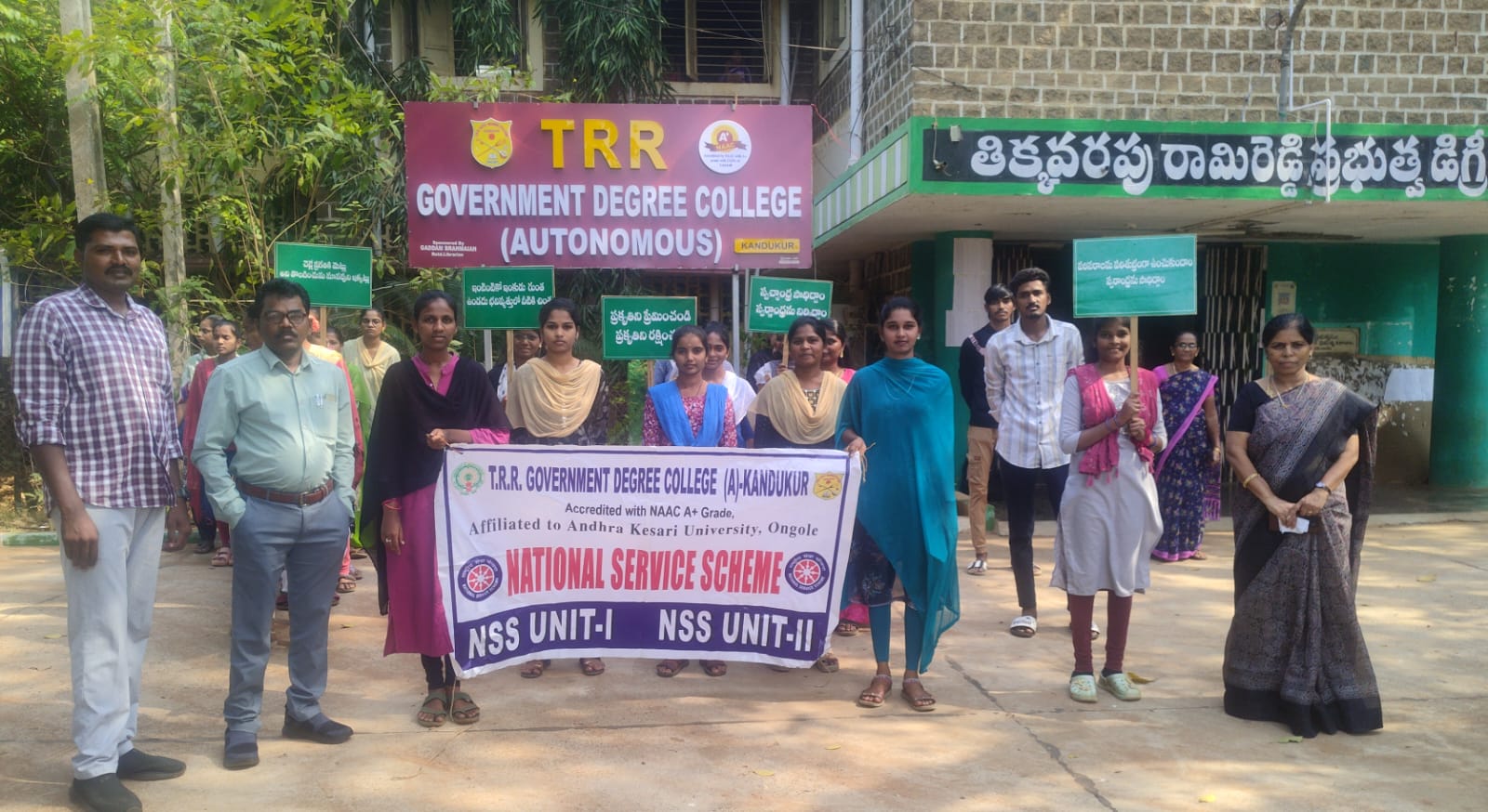 స్థానిక టీఆర్‌ఆర్ ప్రభుత్వ డిగ్రీ కళాశాల (స్వయం ప్రతిపత్తి) వేదికగా శనివారం జాతీయ సేవా పథకం (NSS) యూనిట్-1 మరియు యూనిట్-2 విభాగాల ఆధ్వర్యంలో ‘స్వర్ణాంధ్ర – స్వచ్ఛాంధ్ర’ కార్యక్రమాన్ని నిర్వహించారు. రాష్ట్ర ప్రభుత్వ పిలుపు మేరకు “వాటర్ పాజిటివ్ ఆంధ్ర” అనే ప్రధాన ఇతివృత్తంతో నీటి పరిరక్షణ మరియు జల వనరుల సంరక్షణపై విద్యార్థులకు, సమాజానికి అవగాహన కల్పించడమే లక్ష్యంగా ఈ కార్యక్రమం సాగింది.ఈ సందర్భంగా ఏర్పాటు చేసిన సదస్సులో కళాశాల వైస్ ప్రిన్సిపాల్ డా.ఏడుకొండలు నరేంద్ర మాట్లాడుతూ, పెరుగుతున్న జనాభా, మారుతున్న వాతావరణ పరిస్థితుల వల్ల భూగర్భ జలాలు అడుగంటిపోతున్నాయని ఆందోళన వ్యక్తం చేశారు. రాబోయే తరాలకు నీటి కరువు లేకుండా చూడాలంటే ప్రతి ఇంటిలోనూ, ప్రతి విద్యా సంస్థలోనూ నీటిని ఒడిసిపట్టే వ్యవస్థలు ఉండాలని సూచించారు. వాటర్ పాజిటివ్ ఆంధ్ర అనేది కేవలం నినాదం మాత్రమే కాదని, అది ఒక సామాజిక బాధ్యత అని ఆయన ఉద్ఘాటించారు. ఐ.క్యూ.ఏ.సి (IQAC) కోఆర్డినేటర్ డా.పి.రాజ గోపాల్ బాబు మాట్లాడుతూ, నీటి వృధాను అరికట్టడంలో విద్యార్థులు రాయబారులుగా పనిచేయాలని కోరారు. కళాశాల ప్రాంగణంలో ఉన్న సహజ వనరులను కాపాడుకోవడం ద్వారా మనం పర్యావరణ సమతుల్యతను కాపాడగలమని వివరించారు. అనంతరం విద్యార్థులు తమ సృజనాత్మకతను చాటుతూ నీటి పొదుపుపై రూపొందించిన వివిధ అవగాహన పోస్టర్లను ప్రదర్శించారు. ఈ పోస్టర్ల ద్వారా వర్షపు నీటిని నిల్వ చేయడం, కలుషిత నీటిని శుద్ధి చేయడం మరియు నీటి వినియోగంలో పొదుపు పాటించడం వంటి అంశాలను చక్కగా వివరించారు. ఇందులో భాగంగా ఎన్.ఎస్.ఎస్ వాలంటీర్లు క్షేత్రస్థాయిలో శ్రమదానం చేపట్టారు. కళాశాల ఆవరణలో ఉన్న ఇంకుడు గుంతలను శుభ్రం చేసి, వర్షపు నీరు భూమిలోకి ఇంకేలా చర్యలు తీసుకున్నారు. అలాగే కళాశాలలోని ఆక్వాటిక్ పాండ్‌ను (జల కుంట) శుద్ధి చేసి, దాని పరిసరాలను పరిశుభ్రంగా తీర్చిదిద్దారు. వ్యవసాయ రంగంలో నీటి వినియోగాన్ని తగ్గించే డ్రిప్ ఇరిగేషన్ (బిందు సేద్యం) పద్ధతులపై కళాశాలలోని మియావాకి నగరవనంలో ఏర్పాటు చేసిన డ్రిప్ ఇరిగేషన్ వ్యవస్థ ద్వారా విద్యార్థులకు ప్రయోగాత్మక అవగాహన కల్పించారు. డ్రిప్ పైపుల నిర్వహణ, వాటిని శుభ్రం చేసే విధానం మరియు తక్కువ నీటితో మొక్కలను ఎలా పెంచవచ్చో ప్రత్యక్షంగా వివరించారు.ఈ కార్యక్రమంలో ఎన్.ఎస్.ఎస్ యూనిట్-1 కోఆర్డినేటర్ కోటపాటి నరేష్ రాజా, యూనిట్-2 కో-ఆర్డినేటర్ డా. కె. పద్మావతి, కళాశాల జంతు శాస్త్ర విభాగం, సీనియర్ అధ్యాపకులు, బోధనేతర సిబ్బంది మరియు విద్యార్థిని విద్యార్థులు పాల్గొని విజయవంతం చేశారు.