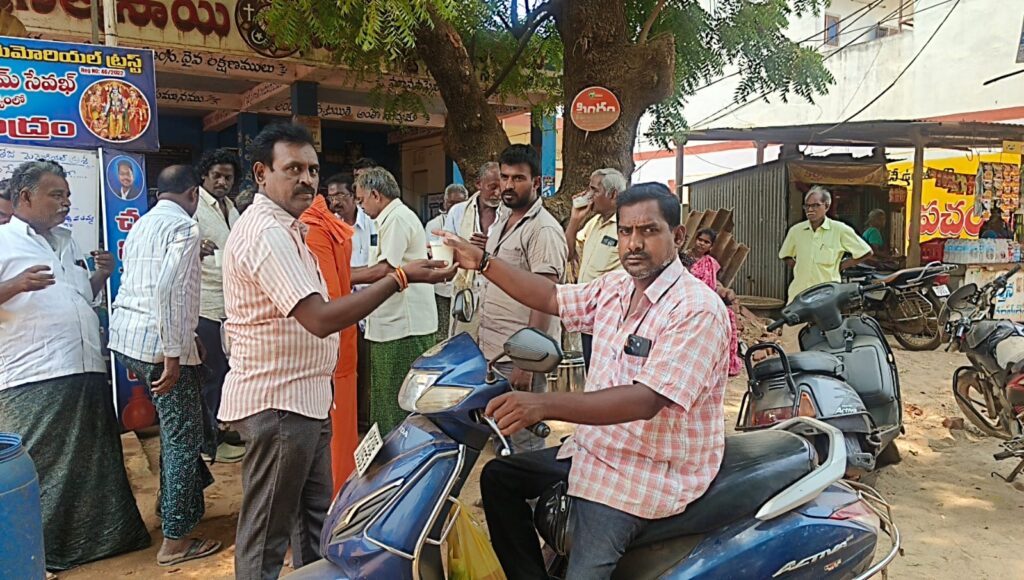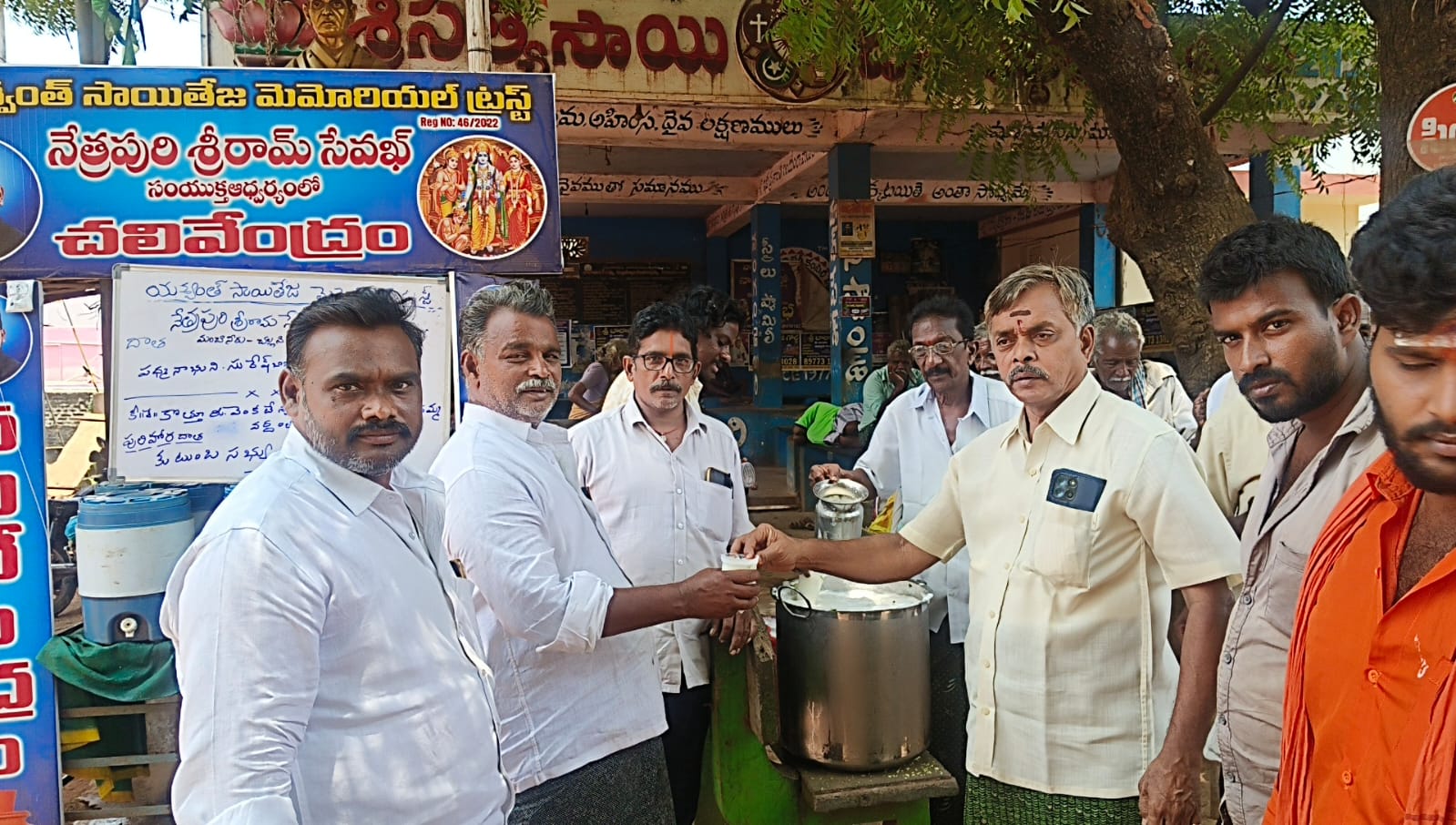 ప్రకాశం జిల్లా గుడ్లూరు మండల కేంద్రంలో బస్టాండ్ సెంటర్ లో ఉన్న పొట్టి శ్రీరాములు గారి విగ్రహం వద్ద నేత్రపురి శ్రీరామసేవక్ మరియు యశ్వంత్ సాయి తేజ మెమోరియల్ ట్రస్ట్ వారి సంయుక్త ఆధ్వర్యంలో గుడ్లూరు వాస్తవ్యులు కీర్తిశేషులు కొత్తూరు వెంకటేశ్వర్లు గారి ధర్మపత్ని పద్మావతమ్మ గారి వర్ధంతి తిధి సందర్భంగా వ్యాపార రిత్యా అనంతపురంలో ఉంటున్నటువంటి కొత్తూరు సురేష్ (చిన్న) కుటుంబ సభ్యుల సహకారంతో అల్పాహారం (పులిహోర ) పంపిణి,మరియు కందుకూరు వాస్తవ్యులు పద్మనాభునిసురేష్ గారి కుటుంబ సభ్యుల సహకారంతో చల్లని మజ్జిగ పంపిణీ కార్యక్రమం చేయడం జరిగింది.ఈ సందర్భంగా నేత్రపురి శ్రీరామసేవక్ కార్యనిర్వాహకులు మాట్లాడుతూ వేసవిలో కొందరి దాహర్తిని అయినా తీర్చాలన్న సంకల్పం తో మేము వేసవికాలం ముగిసే వరకు మంచినీటి చలివేంద్రాన్ని మరియు అలాగే ఈ మజ్జిగ పంపిణీ కార్యక్రమాన్ని నిర్వర్తిస్తున్నామని, అలాగే దాతల కోరిన రోజు వారి సహకారంతో పేదలకు మరియు ప్రయాణికులకు కొంత ఆకలినైనా తీర్చాలని సంకల్పంతో అల్పాహార పంపిణీ చేయడం జరుగుతుందని తెలియజేశారు. ఈ కార్యక్రమనికి ఎక్కడో అనంతపురంలో వ్యాపారం చేసుకుంటున్నటువంటి కొత్తూరు సురేష్ బాబు గారు తన స్వగ్రామం అయినటువంటి గుడ్లూరులో జరుగుతున్న ఇలాంటి సేవా కార్యక్రమాo ద్వారా అల్పాహార ( పులిహోర ) పంపిణీకి సహకరించటం అభినందనీయమని అన్నారు అలాగే తదుపరి వైశాఖ మాస ఆరంభ పర్వదినాన్ని పురస్కరించుకుని ఈ మాసంలో జలధానం చేయటం వలన దేవతల యొక్క అనుగ్రహం కలుగుతుందని మన పురాణాలు చెబుతున్నాయి ఈ విషయాన్ని గ్రహించిన కందుకూరు వాస్తవ్యులు పద్మనాభుని సురేష్ ధర్మపత్ని సౌజన్య గార్లు ఈరోజు చల్లని మజ్జిగ మరియు మంచినీటి పంపిణీ కార్యక్రమానికి ఆర్థికంగా సహకరించారు. ఈ ఇరువురి కుటుంబ సభ్యులకు మా హృదయపూర్వక ధన్యవాదాలు తెలియజేస్తున్నామని అన్నారు , అలాగే ఈరోజు జరిగిన ఈ కార్యక్రమానికి ముఖ్యఅతిథిగా గుడ్లూరు మండలం సొసైటీ అధ్యక్షులు మాకు అత్యంత ఆప్తులు దామా వెంకటేశ్వర్లు గారు పాల్గొన్నారు వారికి మా హృదయపూర్వక ధన్యవాదాలు తెలియజేస్తున్నామని అన్నారు, ఇప్పటివరకు ఈ చల్లని మజ్జిగ మరియు మంచినీరు పంపిణీ కార్యక్రమానికి ఆర్థికంగా సహకరించిన దాతలు అందరికీ మా ధన్యవాదాలు తెలియజేస్తున్నామని అన్నారు.ఈ కార్యక్రమంలో , నేత్రపురి శ్రీరామసేవక్ కార్యనిర్వాహకులు ఇన్నమూరి సుధాకర్, ఎయిర్టెల్ చిన్న, పెద్దలు తుమ్మల పెంట కొండయ్య శెట్టి,ఇన్నమూరి గరటయ్య,అమరా మాల్యాద్రి,ఇన్నమూరి. గరటయ్య, గొల్ల నాగరాజు, పూజిత మెడికల్స్ మనోహర్,పాజర్ల బ్రహ్మం, జలగం అశోక్ గొల్ల.మణి కంఠ , తదితరులు పాల్గొన్నారు.