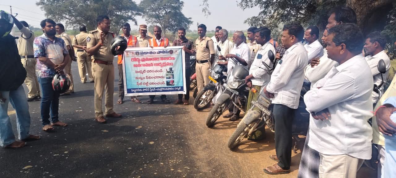 ప్రకాశం జిల్లా పోలీసులు NH-765, పెద్దారవీడు పోలీస్ స్టేషన్ పరిధిలో రోడ్ సేఫ్టీ అవగాహన కార్యక్రమాన్ని విజయవంతంగా నిర్వహించారు. ఈ కార్యక్రమం ద్వారా ద్విచక్ర వాహనదారులకు హెల్మెట్ ధరించడం, ట్రాఫిక్ నియమాలను పాటించడం, అధిక వేగం నివారించడం మరియు బాధ్యతాయుతంగా డ్రైవింగ్ చేయడం ద్వారా రోడ్డు ప్రమాదాలను ముందస్తుగా నివారించగలిగే మార్గాలపై అవగాహన కల్పించబడింది.పోలీసులు హెల్మెట్ కేవలం చట్టపరమైన నిబంధన మాత్రమే కాదు, ప్రాణ రక్షణకు అత్యంత ముఖ్యమైన సాధనం అని గుర్తుచేశారు. భద్రత మరియు రోడ్డు నియమాలపై కొనసాగుతున్న అవగాహన కార్యక్రమాలు ప్రజల జీవితాలను రక్షించడంలో కీలక పాత్ర పోషిస్తాయని అధికారులు తెలిపారు.
