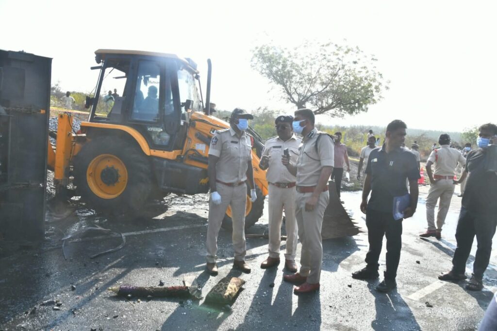 ఈ ఘటనలో 14 మృతి చెందగా 29 మంది సురక్షితంగా బయటపడ్డారు. పలువురు గాయాలయ్యాయి. ప్రమాదం జరిగిన తర్వాత బస్సుకు మంటలు వ్యాపించాయి. బస్సు అద్దాలను పగులగొట్టడంతో ప్రయాణికులు ప్రాణాలతో బయటపడ్డారు.ప్రమాద సంఘటన గురించి తెలుసుకున్న జిల్లా ఎస్పీ వెంటనే సంఘటనా స్థలానికి ఫైర్ ఇంజిన్లు మరియు అంబులెన్సులను పంపించి, తాను కూడా అక్కడికి చేరుకొని పరిస్థితిని పరిశీలిస్తూ రెస్క్యూ టీంతో కలిసి సహాయక చర్యలు చేపట్టి, క్షతగాత్రులను వెంటనే ఆసుపత్రికి తరలించామని తెలిపారు. అనంతరం బస్సు కిటికీలో నుంచి దూకిన కొందరు ప్రయాణికులకు గాయాలు కాగా ఆస్పత్రికి తరలించి క్షతగాత్రులను పరామర్శించి క్షేమ సమాచారాలను తెలుసుకున్నారు.అక్కడి ప్రయాణికులతో మాట్లాడి కేసు నమోదు చేయడంతో పాటు దర్యాప్తు వేగవంతం చేయాలని సంబంధిత అధికారులను ఆదేశించారు. ప్రయాణికులకు సురక్షితంగా వారి ప్రదేశాలకు వెళ్ళుటకు తగిన ఏర్పాటు చేయడం జరిగింది.