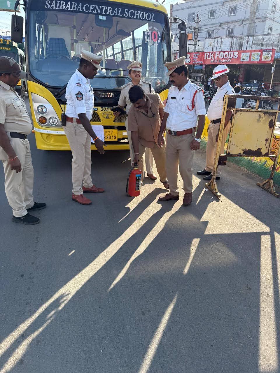 ప్రకాశం జిల్లా ఎస్పీ శ్రీ వి. హర్షవర్ధన్ రాజు, ఐపీఎస్ ఆదేశాల మేరకు జిల్లా వ్యాప్తంగా ఉన్న అన్ని పోలీస్ సబ్ డివిజన్ల పరిధిలో ప్రైవేట్ పాఠశాలలు మరియు కళాశాలలకు చెందిన బస్సులపై పోలీసు మరియు రవాణా శాఖ అధికారులు సంయుక్తంగా ప్రత్యేక తనిఖీలు నిర్వహించారు. విద్యార్థుల భద్రత, రక్షణను అత్యంత ప్రాధాన్యంగా పరిగణిస్తూ ప్రత్యేక డ్రైవ్ చేపట్టినట్లు జిల్లా ఎస్పీ తెలిపారు.ఈ తనిఖీలలో పోలీసులు బస్సుల ఫిట్నెస్ సర్టిఫికెట్లు, ఇన్స్యూరెన్స్ పత్రాలు, డ్రైవర్ల లైసెన్సులు, వాహనాల రిజిస్ట్రేషన్ పత్రాలు తదితరాలను పరిశీలించారు.అంతేకాకుండా, బస్సుల్లో ఉండే ఫైర్ ఎక్స్టింగ్విషర్లు, ఫస్ట్ ఎయిడ్ బాక్స్లు, ఎమర్జెన్సీ ఎగ్జిట్లు, సీటింగ్ సామర్థ్యం వంటి అంశాలను కూడా అధికారులు పరిశీలించారు. ఈ తనిఖీల సందర్భంగా కొన్ని వాహనాల్లో నిర్లక్ష్యంగా నిర్వహణ జరిగినట్లు గుర్తించగా వాటిపై చట్టపరమైన చర్యలు తీసుకున్నారు. విద్యార్థుల భద్రత విషయంలో ఎట్టి పరిస్థితుల్లోనూ రాజీ పడబోమని పోలీసులు స్పష్టం చేశారు.డ్రైవర్లకు రోడ్డు భద్రతా నియమాలు, ట్రాఫిక్ రూల్స్ పాటించాలని, అతివేగం వలన కలిగే ప్రమాదాలు వంటి అంశాలపై పోలీస్ అధికారులు కౌన్సెలింగ్ నిర్వహించారు.డ్రైవర్లు ఎప్పటికప్పుడు తగిన విశ్రాంతి తీసుకోవడం, మద్యం లేదా మత్తు పదార్థాల ప్రభావంలో వాహనాలు నడపకూడదని ప్రత్యేకంగా హెచ్చరించారు.ప్రైవేట్ విద్యాసంస్థల యాజమాన్యాలు తమ విద్యార్థుల రవాణా బాధ్యతను అత్యంత జాగ్రత్తగా నిర్వహించాలని, వాహనాలపై రవాణా నిబంధనలను తప్పనిసరిగా పాటించాలని పోలీస్ అధికారులు ఆదేశించారు.ఉదయం, సాయంత్రం సమయంలో డ్రైవర్ వాహనం తీసుకుని విద్యార్థుల కోసం వెళుతున్న సమయంలో స్కూల్ యాజమాన్యం చెక్ చేసి పంపాలని పోలీసులు సూచించారు.నిబంధనలు అతిక్రమించిన వారిపై చట్టపరమైన చర్యలు తప్పవని హెచ్చరించారు.