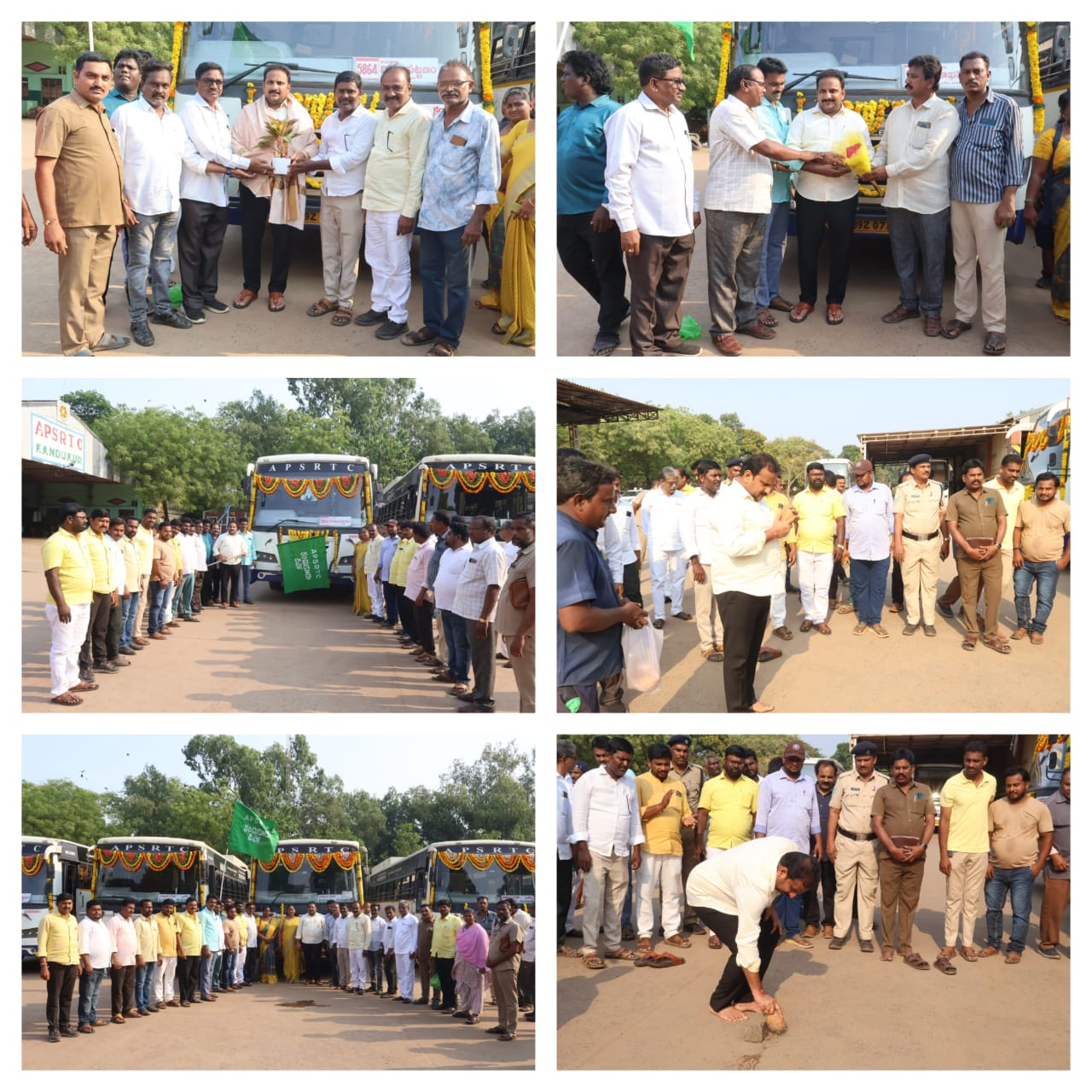 కందుకూరు ఆర్టీసీ డిపో నుంచి వివిధ ప్రాంతాలకు కొత్తగా నడపబోతున్న 5 బస్సు సర్వీసులను ఎమ్మెల్యే ఇంటూరి నాగేశ్వరరావు గారు ఆదివారం ప్రారంభించారు. కందుకూరు నుండి గుంటూరుకు టుస్టార్ సర్వీసులు 3, కందుకూరు నుంచి గుడ్లూరు, భీమవరం ఉలవపాడు మీదుగా హైదరాబాద్ బి హెచ్ఇఎల్ వరకు ఒకటి, కందుకూరు నుండి విశాఖపట్నంకు మరొక సర్వీసును ఎమ్మెల్యే గారు జెండా ఊపి ప్రారంభించారు. ఈ సందర్భంగా ఎమ్మెల్యే నాగేశ్వరరావు మాట్లాడుతూ కందుకూరు ప్రాంత ప్రయాణికులకు అనుకూలంగా ఉండేలా కొత్త బస్సు సర్వీసులను అందుబాటులోకి తీసుకు వస్తున్నట్లు చెప్పారు. అలాగే కందుకూరు డిపో పరిధిలో… కాలం చెల్లిన బస్సుల స్థానంలో కొత్త బస్సులు తీసుకువచ్చేలా సంబంధిత మంత్రితో మాట్లాడతానని తెలిపారు. పలు గ్రామాలకు నడుస్తున్న బస్సు సర్వీసులు, కొత్తగా నడపాల్సిన సర్వీసులపై అధికారులకు పలు సూచనలు చేశారు.ఈ కార్యక్రమంలో ఆర్టీసీ డిపో డిఎం ఆర్ శ్రీనివాసులు, ట్రాఫిక్ ఇన్స్పెక్టర్ ప్రసాద్, పట్టణ టిడిపి అధ్యక్షులు దామా మల్లేశ్వరరావు, పార్టీ నాయకులు బెజవాడ ప్రసాద్, గోచిపాతల మోషే, కల్లూరి శైలజ, పువ్వాడి మౌనిక, ముచ్చు లక్ష్మీరాజ్యం, పార్వతి, చుండూరి శ్రీనివాసులు, మేడా మల్లికార్జున, గుమ్మా శివ, మచ్చా మనోహర్, అత్తింటి శివకృష్ణ, నల్లూరి సూర్యనారాయణ, భవనాసి వెంకటేశ్వర్లు, చుంచు వేణు శ్రావణ్, శివరామకృష్ణ, దారం విజయ్, యూనియన్ నాయకులు నల్లూరి సుబ్బారావు, శివకృష్ణ, డివై కొండలు మరియు ఆర్టీసీ అధికారులు పాల్గొన్నారు.