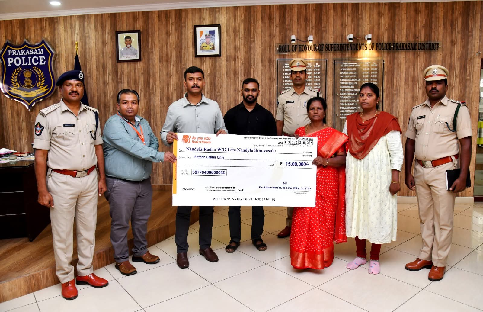 ప్రకాశం జిల్లా దొనకొండ పోలీస్ స్టేషన్ లో విధులు నిర్వర్తిస్తూ తేదీ:11.11.2025 న అనారోగ్యంతో మరణించిన కీర్తి శేషులు హెడ్ కానిస్టేబుల్ నంద్యాల శ్రీనివాసులు (G.No.1620) గారి భార్య రాధకి బ్యాంకు అఫ్ బరోడా వారు పోలీస్ శాలరీ ప్యాకేజీ పధకం కింద అందించిన రూ.15,00,000/- చెక్కును మంగళవారం జిల్లా పోలీస్ కార్యాలయంలో జిల్లా ఎస్పీ అందచేసినారు.ఈ సందర్భంగా జిల్లా ఎస్పీ వారి కుటుంబం యొక్క యోగక్షేమాలు అడిగి తెలుసుకున్నారు. అనారోగ్యంతో మరణించడం చాలా బాధాకరమని, మీరంతా పోలీస్ శాఖలో భాగమని, వారికి ప్రభుత్వం నుండి అందవలసిన ఇతర అన్ని బెనిఫిట్స్ లను త్వరితగతిన వచ్చేలా చర్యలు తీసుకుంటామన్నారు. ఈరోజు అందజేసిన ఆర్థిక సహాయం ద్వారా కుటుంబానికి కొంత భరోసా కలుగుతుందనే ఆశిస్తున్నామన్నారు. ఏదైనా సమస్య ఉన్న నేరుగా తనను కలవవచ్చని, పోలీసు శాఖ వారికి అండగా నిలుస్తుందని ఎస్పీ వారికి భరోసా కల్పించారు. ఈ కార్యక్రమంలో ఎఆర్ డిఎస్పీ కె.శ్రీనివాసరావు, ఆర్ఐ రమణారెడ్డి, సీతారామిరెడ్డి, MSME బ్రాంచ్, ఒంగోలు, బ్యాంకు అఫ్ బరోడా మేనేజర్ వికాస్ కుమార్ మరియు తదితరులు పాల్గొన్నారు.