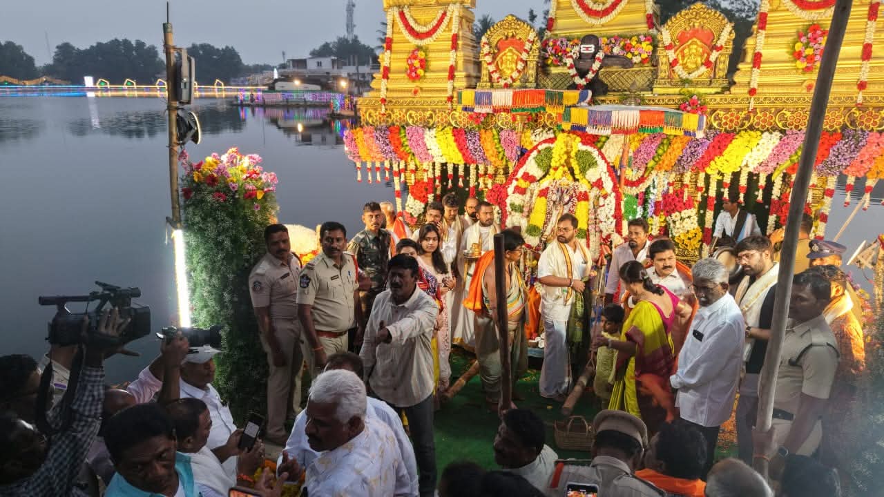ప్రకాశం జిల్లా ఎస్పీ ఆదేశాల మేరకు, టంగుటూరు ప్రాంతంలో నిర్వహించిన తెప్పోత్సవం వేడుకలు ప్రశాంతంగా, సజావుగా సాగేందుకు ప్రకాశం జిల్లా పోలీసులు విస్తృత స్థాయిలో బందోబస్తు విధులు నిర్వహించారు.ఉత్సవ ప్రాంగణంతో పాటు పరిసర ప్రాంతాల్లో పోలీసు సిబ్బందిని వ్యూహాత్మకంగా మోహరించి, గుంపుల నియంత్రణ, ట్రాఫిక్ నిర్వహణ, భక్తుల భద్రతపై ప్రత్యేక దృష్టి సారించారు. అలాగే స్కై ఐ ప్రకాశం పోలీస్ ప్రాజెక్ట్ పరిధిలో డ్రోన్ నిఘా ద్వారా నిరంతర పర్యవేక్షణ నిర్వహిస్తూ, ఎలాంటి అనుకోని ఘటనలు చోటుచేసుకోకుండా ముందస్తు భద్రతా చర్యలు తీసుకున్నారు.ప్రజలు మరియు భక్తులు పోలీసులకు పూర్తి సహకారం అందించడంతో తెప్పోత్సవం శాంతియుతంగా విజయవంతంగా ముగిసిందని జిల్లా పోలీసులు తెలిపారు.
